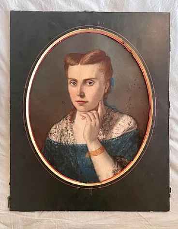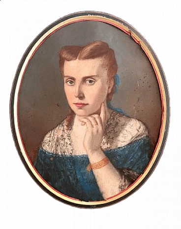 Antico dipinto ovale raffigurante il profilo di una bella signora in abito blu, realizzato nel XVIII secolo in Francia. Il soggetto femminile, ben vestito, è seduto di profilo, con i capelli accuratamente appuntati sulle spalle. Indossa un braccialetto rosso. La tela ovale è avvolta da un rivestimento antico. L'opera non è firmata dall'artista. Montata su carta e tesa su pannello. Sono presenti i normali segni della vecchiaia, come piccole crepe della carta nel bordo, foxing e leggere macchie. Presenta sola una piccolissima crepa della carta nella parte destra dello sfondo, facilmente ripristinabile.