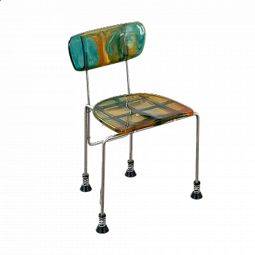 Sedia modello Broadway di Gaetano Pesce. Presenta una seduta e schienale in resina epossidica, una struttura in alluminio cromato e piedini in gomma, realizzata nel 1993.