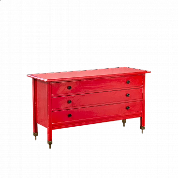 Cassettiera rossa in legno con piedini in ottone disegnata da Carlo De Carli per Sormani, anni '60. Dotata di tre cassetti.