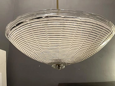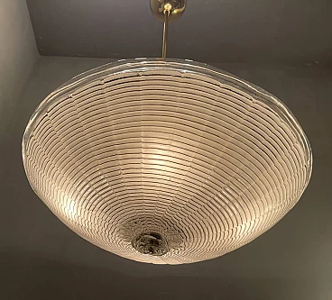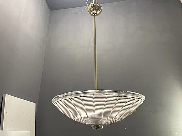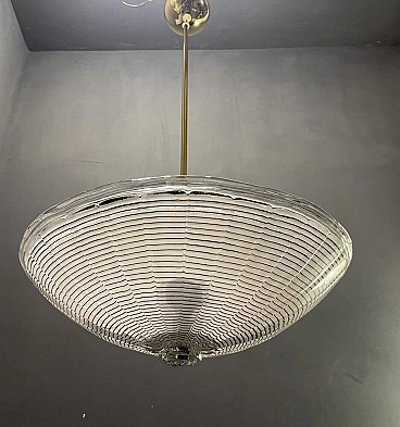 Lampadario con paralume in vetro di Murano trasparente e struttura in metallo dorato, anni '80. Necessita di quattro lampadine E27. È stato ricablato ed è compatibile con Europa, UK e USA. Altezza totale (stelo e rosone inclusi): 85 cm. Altezza del paralume: 20 cm.