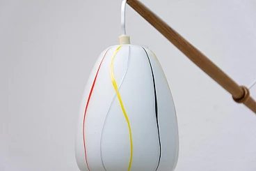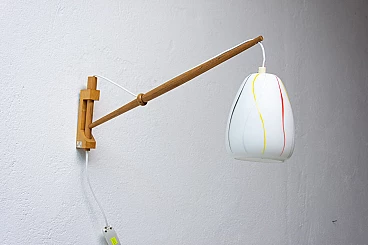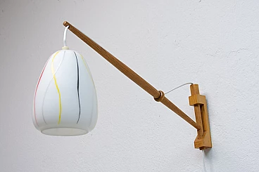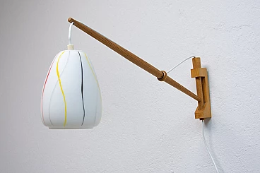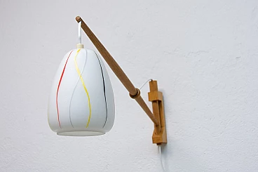 Coppia di applique di ULUV, anni '60. Struttura in faggio e paralume in vetro bianco con decorazione multicolore. Necessitano di una lampadina E27 fino a 250V ciascuna. Sono state ricablate. Altezza del paralume: 15 cm.