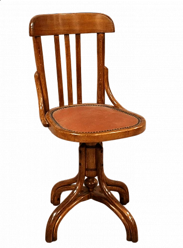 Sedia girevole in legno curvato e tessuto di Baumann, prima metà del '900. Dotata di vite per la regolazione dell'altezza. È stata restaurata ma è stato lasciato il tessuto originale.