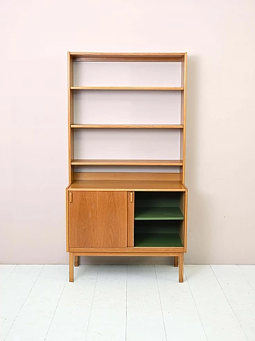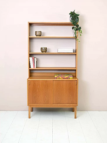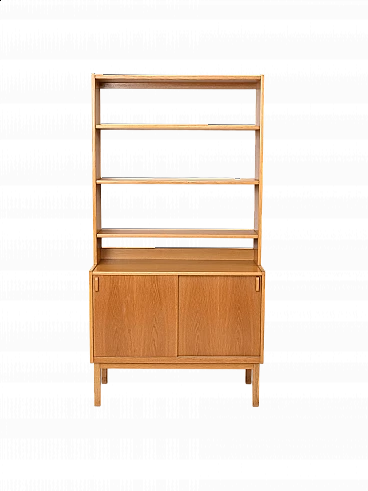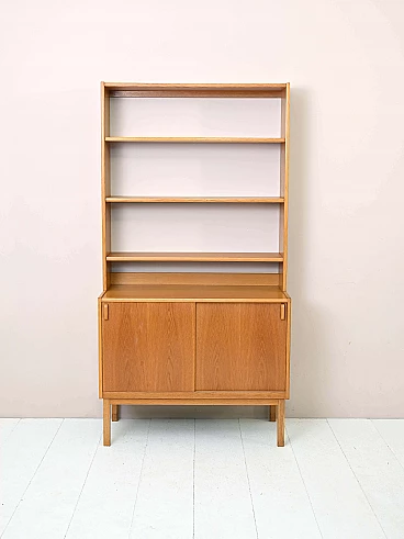 Libreria in legno di Bertil Fridhagen per Bodafors, anni '60. Costituita da un mobile ad ante scorrevoli nella parte inferiore e tre mensole liberamente posizionabili in quella superiore. È stato effettuato un restauro conservativo con prodotti di origine naturale.