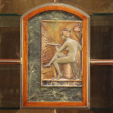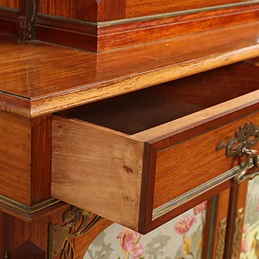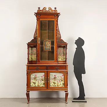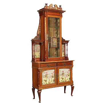 Credenza Liberty in legno con vetrina e pannelli in ceramica, inizio '900