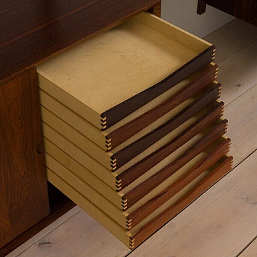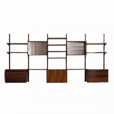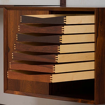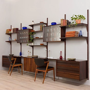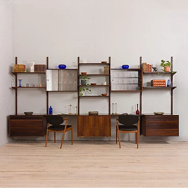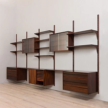Uno dei più pregiati pensili danesi della metà del secolo scorso in palissandro, disegnato da Poul Cadovius e prodotto da Cado negli anni '60.Si tratta di una parete attrezzata a 5 vani interamente modulare, con cinque armadi e dieci ripiani, tra cui due ripiani profondi che possono essere utilizzati come scrivanie. Ottimo per riporre ed esporre libri e decorazioni. Si tratta di una parete attrezzata a 5 vani interamente modulare, con cinque armadi e dieci ripiani, tra cui due ripiani profondi che possono essere utilizzati come scrivanie. Ottimo per riporre ed esporre libri e decorazioni.