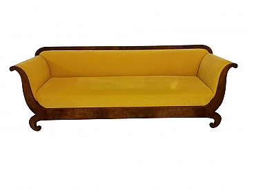 Divano a barca in legno di noce ricoperto in tessuto giallo, primi '800