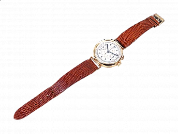 Orologio da polso Universal Watch, calibro 16 (339), cassa in oro 18 k. Monopulsante a ore 2, prodotto in Svizzera, anni '30. L'orologio è funzionante e in condizioni esteriori molto buone, come è possibile constatare dalle foto allegate. Riporta qualche segno sulla cassa e sul vetro, visibili in foto. Qualche piega sulla pelle del cinturino. Valutare attraverso le foto. Dimensioni cassa Ø 39 mm.