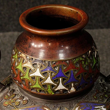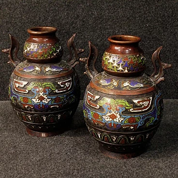 Coppia di vasi orientali in metallo cesellato con smalti cloisonné