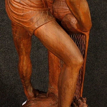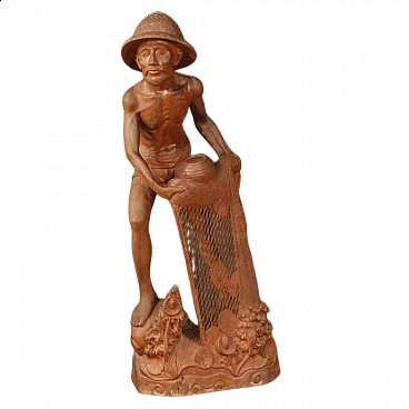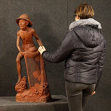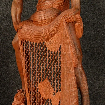 Scultura orientale in legno scolpito raffigurante un pescatore con rete da pesca, realizzata nel '900. Presenta piccoli segni del tempo e due piccole mancanze di fili della rete.