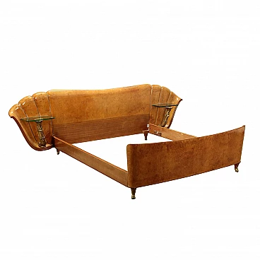 Letto matrimoniale con ripiani/comodini in vetro. Realizzato in legno impiallacciato di radica con filetti in ottone.