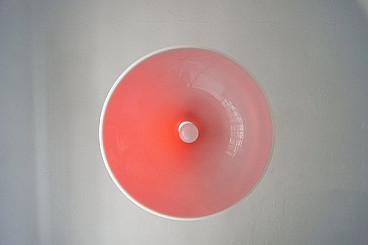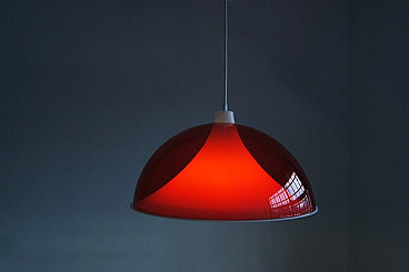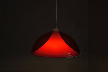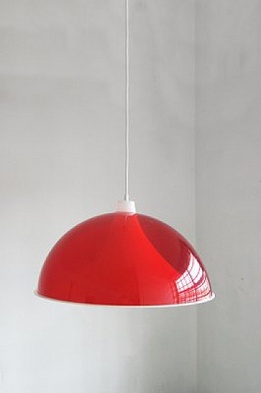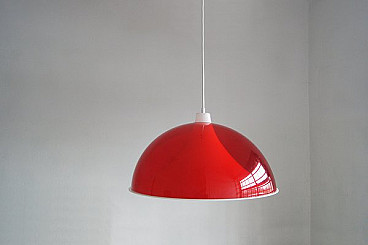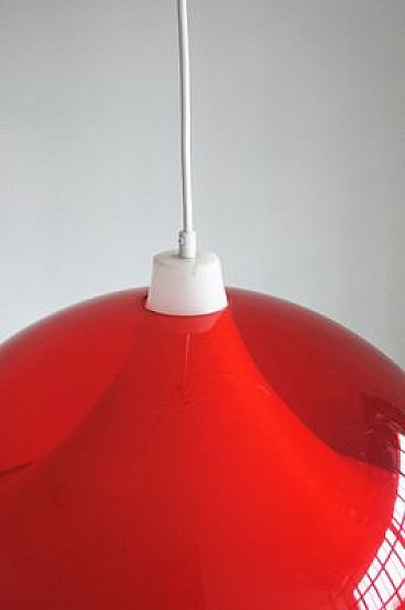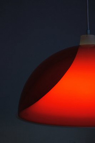 Una meravigliosa lampada a sospensione vintage degli anni '60 con un paralume che ricorda il design della lampada a sospensione Kuplat di Yki Nummi o la lampada a sospensione Martinelli Luci. Paralume semicircolare in acrilico rosso trasparente. Diffusore in acrilico bianco all'interno. La lampada produce una luce morbida e diffusa.