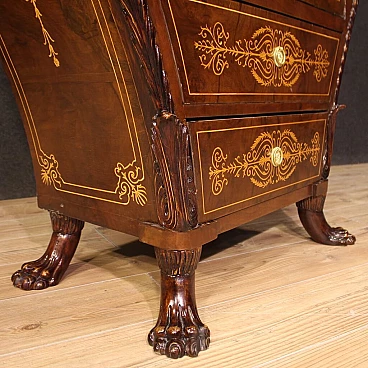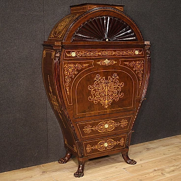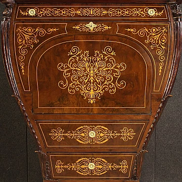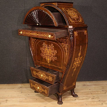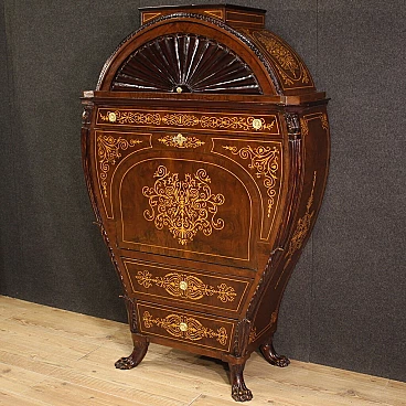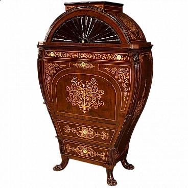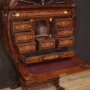Secretaire austriaco del XX secolo. Mobile in stile Biedermeier elegantemente intarsiato, impiallacciato e scolpito in legni di noce, acero faggio e legni da frutto. Secretaire costruito in un unico corpo, mosso sui fianchi, munito di due cassetti nella parte inferiore, calatoia centrale e due cassetti nella parte superiore (vedi foto). Interno del secretaire di grande fascino completo di 8 cassettini, vano centrale adornato da colonnine e piccolo specchio, piano scrittoio rivestito in finta pelle (vedi foto). Mobile ideale da inserire in un salone, salotto o studio, di favoloso arredamento, per antiquari e arredatori. Secretaire sostenuto da quattro piedi zoomorfi a sciabola, di buona solidità (vedi foto). Un piede presenta una piccola sbeccatura di un artiglio. Mobile strutturalmente sano, nel complesso in buono stato conservativo.