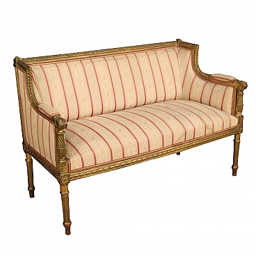 Divanetto italiano della metà del XX secolo. Mobile in stile Luigi XVI in legno scolpito e dorato di bella linea e piacevole arredamento. Divano a due posti, finito da centro, sostenuto da quattro gambe scolpite in carattere di discreta solidità. Imbottitura in discrete condizioni, da revisionare per una perfetta comodità. Mobile di ottima proporzione, facilmente inseribile in diversi punti della casa, ideale per una camera, salotto o studio. Divano rivestito in tessuto con qualche segno di usura e alcune macchie, da sostituire (vedi foto). Strutturalmente sano, da restaurare. Altezza alla seduta 46 cm.