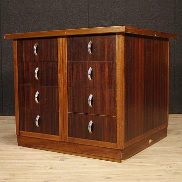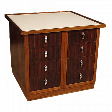 Cassettiera in legno con maniglie in metallo cromato e piano in similpelle, anni '60
