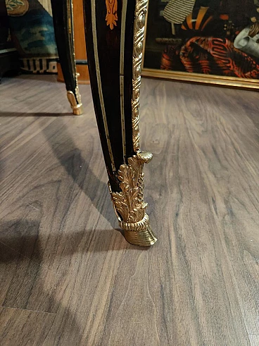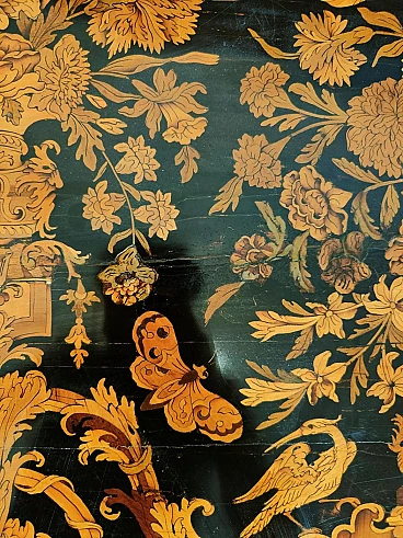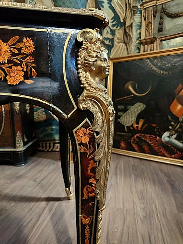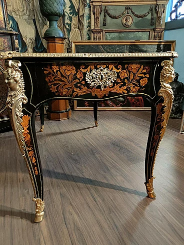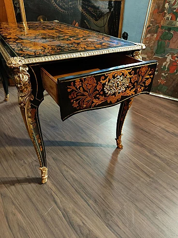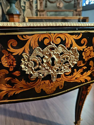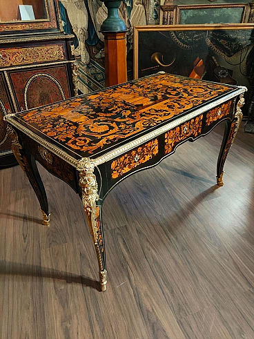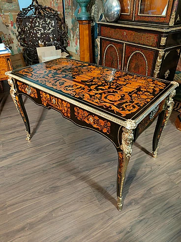 Scrivania intarsiata con raffigurazioni floreali, animali e applicazioni in bronzo dorato, '800