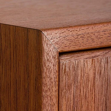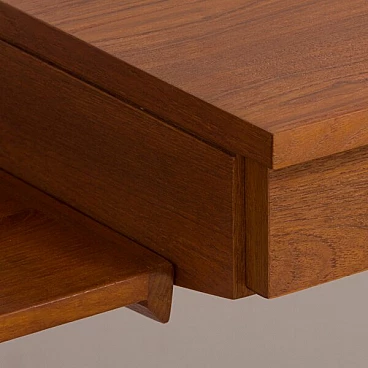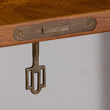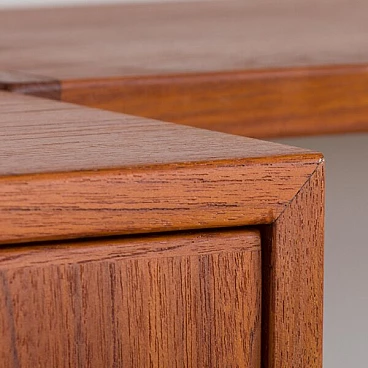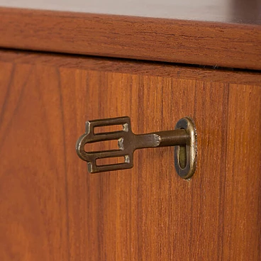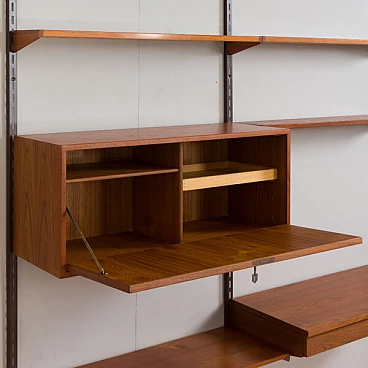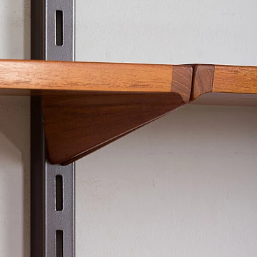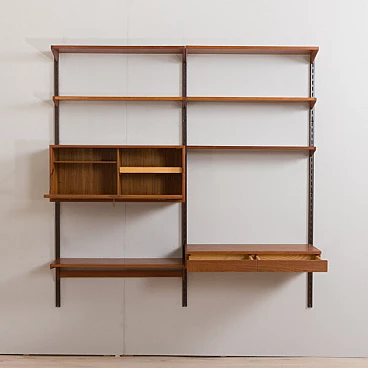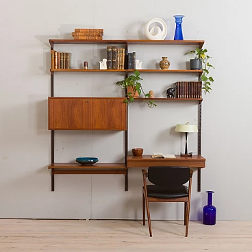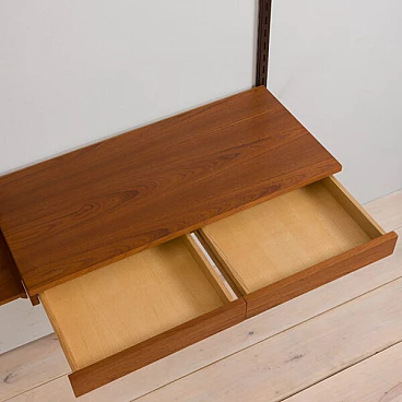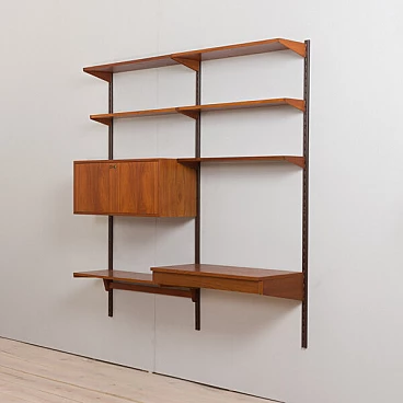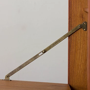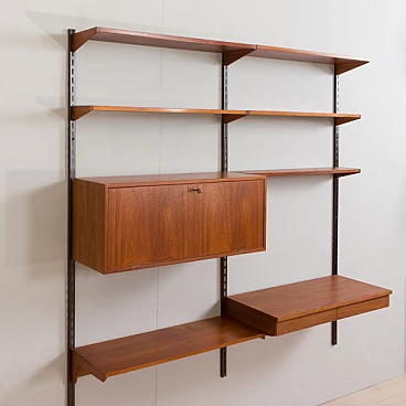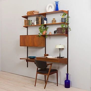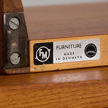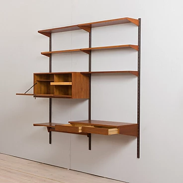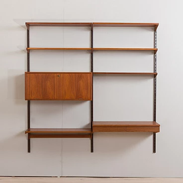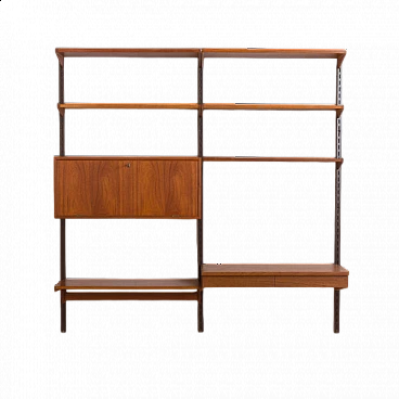 Semplice ed elegante libreria danese a due vani in teak disegnata da Kai Kristiansen negli anni '60 e prodotta da FM Mobler. Un funzionale armadietto con serratura (la chiave è inclusa) e sei ripiani di varia profondità offrono spazio sufficiente per libri e decorazioni. Una comoda scrivania con due cassetti creerà uno spazio home office in un soggiorno o in una camera da letto. Il pensile è caratterizzato da una brillante falegnameria e da ricche venature di teak. Questo set è composto da: 3 ripiani profondi 18 cm; 2 ripiani profondi 24 cm; 1 ripiano profondo 32 cm; 1 scrivania H: 16 / L: 86/ P: 40 cm; 1 mobile bar H: 36/ L: 86/ P: 32 cm, chiave originale inclusa; 3 binari in metallo, ciascuno lungo 175 cm.