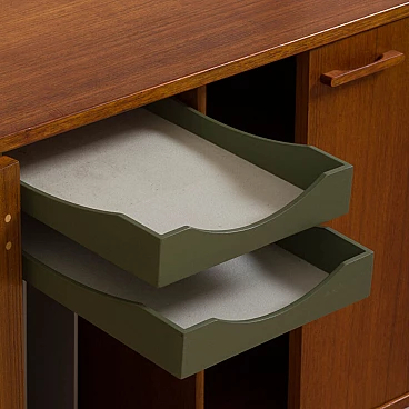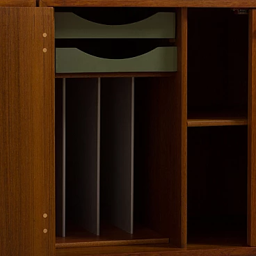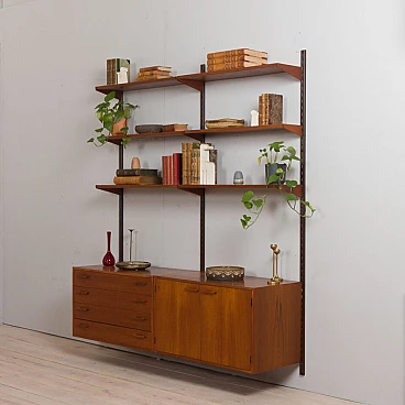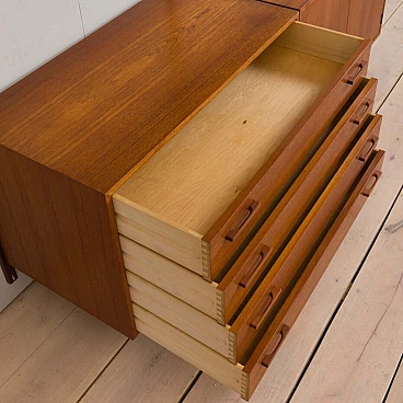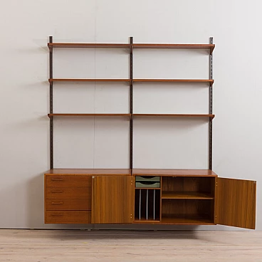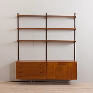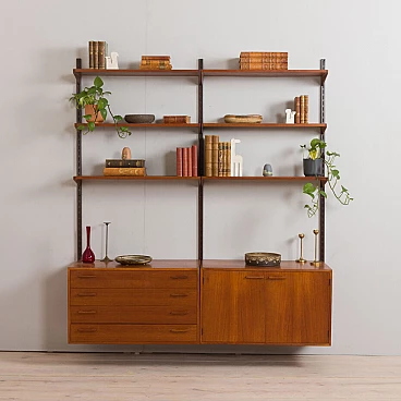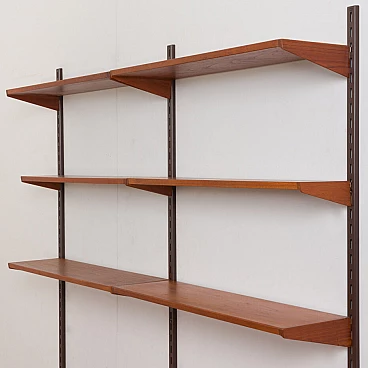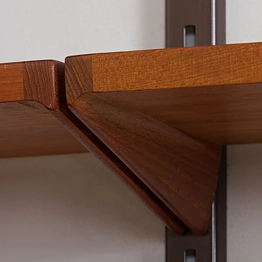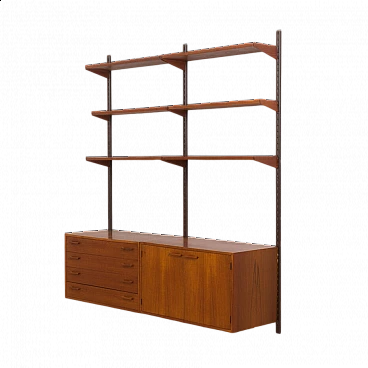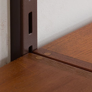 Ogni sezione è larga 86 cm ed è possibile disporre tutti i pezzi a proprio piacimento utilizzando un facile sistema di staffe metalliche che si inseriscono nei binari. Il set è in fantastiche condizioni vintage. Quasi nessun segno di usura. Un grande esempio di abilità della falegnameria danese della metà del XX secolo.