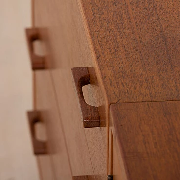 Un'elegante e funzionale libreria modulare danese in teak disegnata da Kai Kristiansen è stata prodotta da FM Mobelr negli anni '60, come conferma l'etichetta originale. Le belle venature del teak e le maniglie curve in teak massiccio aggiungono un tocco di imponenza. Sei scaffali, una cassettiera e un mobile funzionale con cassetti e scomparti interni offrono spazio sufficiente per riporre oggetti e libri.