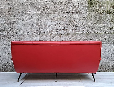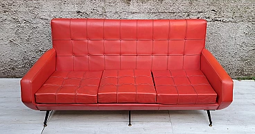 Divano a tre posti in skai rosso con piedi regolabili in ottone, anni '50