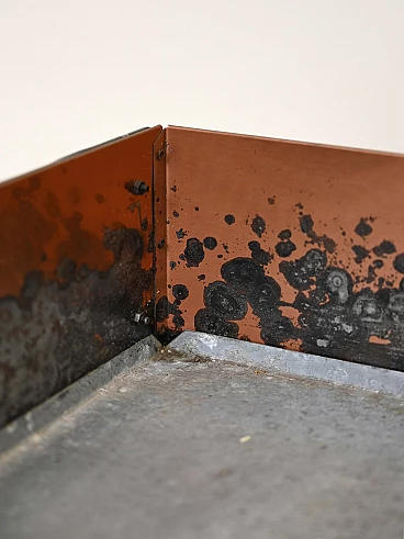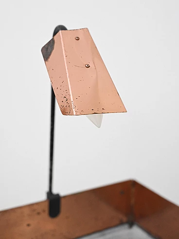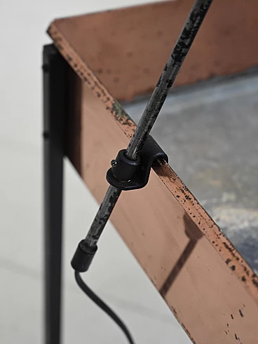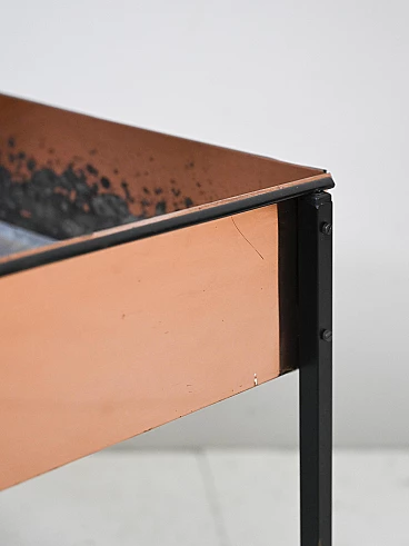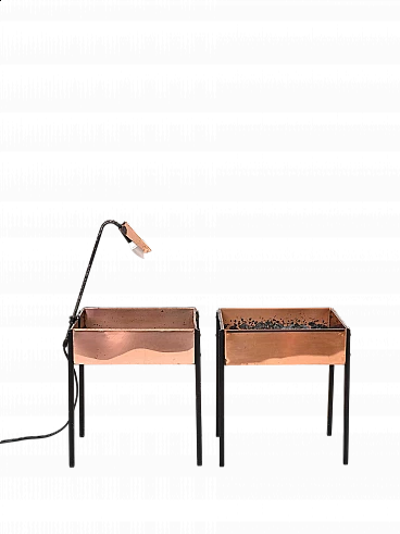 Coppia di fioriere vintage di modernariato. Degli oggetti particolari formati da una semplice base in rame quadrata e da sottili gambe in metallo nero. Una delle due fioriera ha una lampada rimovibile, anch’essa con il paralume in rame. Buone condizioni vintage. Per piacere presta attenzione alle fotografie.