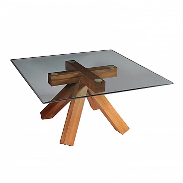 Tavolo La Corte progettato da Mario Bellini per Cassina con base centrale in legno, piano in vetro.