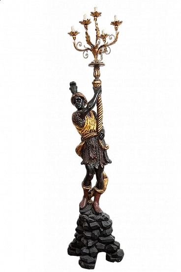 Scultura in legno policromo raffigurante Moro Veneziano, realizzato a Venezia a inizio '900. La figura è in piedi su un basamento a forma di scoglio in legno ebanizzato e regge tra le mani una cornucopia che diventa candelabro.