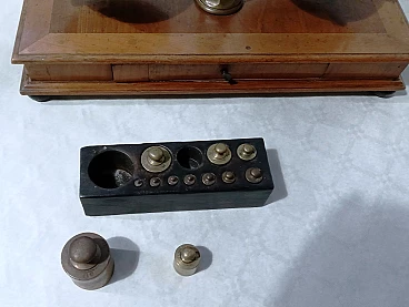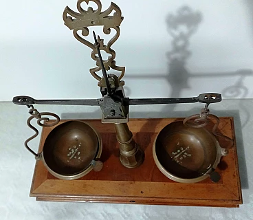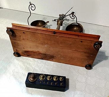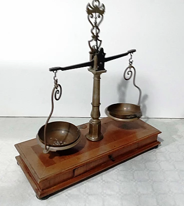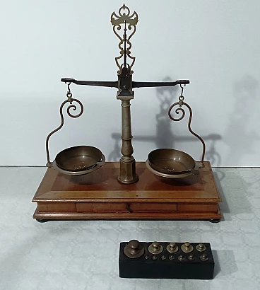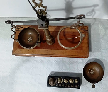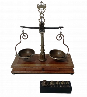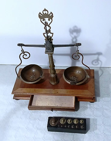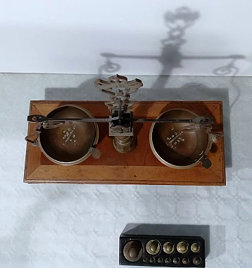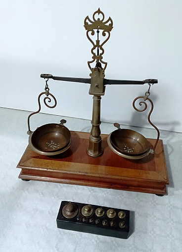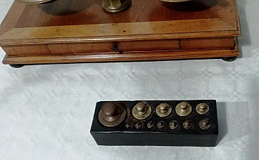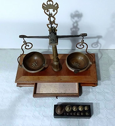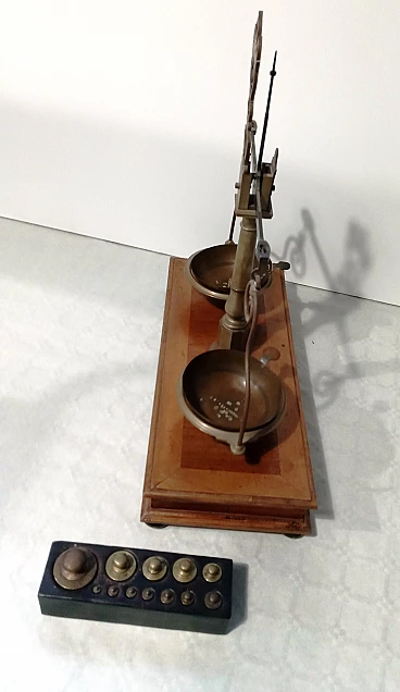 Bilancia da farmacia in legno e ottone, anni '50