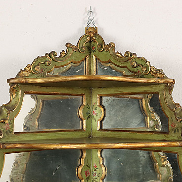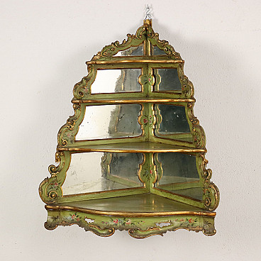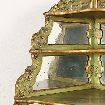 Angoliera pensile stile Rococò realizzata a Venezia a fine '800. Struttura in legno laccato e dorato con intagli di riccioli e rocaille e motivi floreali dipinti, ripiani con specchi.