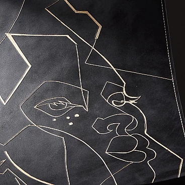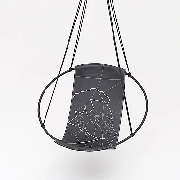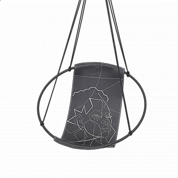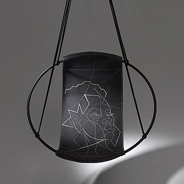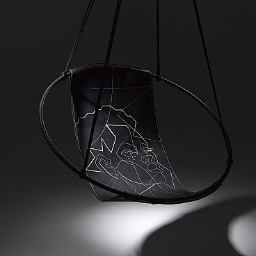 Poltrona sospesa Face of Africa in pelle. Questa poltrona è stata progettata in collaborazione con Tsepo Makate, artista e illustratore sudafricano, che ha realizzato la bellissima immagine visibile sulla pelle. Sono disponibili disegni diversi (volti africani, piante e l'amata gru blu simbolo del Sud Africa): contattare direttamente il venditore per avere maggiori informazioni. Spogliata di ogni eccesso, questa poltrona sospesa ha una struttura circolare con il lembo di pelle sospeso al suo interno, molto elegante e confortevole. Le linee pulite e la leggerezza di questa poltrona la rendono perfetta per qualsiasi spazio. Ogni disegno è inciso sulla spessa pelle lasciando un solco esposto e non tinto. Ogni poltrona è fatta a mano con cura dai nostri artigiani. La bellezza della pelle è che ogni pezzo ha segni e caratteristiche naturali, il che significa che ogni esemplare è unico, con una propria personalità; per questo motivo potrebbero quindi esserci lievi variazioni di colore. Con il tempo e l'uso la pelle cambia, sviluppa un proprio carattere e crea una patina originale, finisce per raccontare una storia.