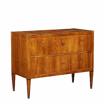 Cassettone formato da fronte a due cassetti impiallacciati in ciliegio e piedi tronco piramidali con bordo del piano e filettature in castagno. Maniglie mancanti.