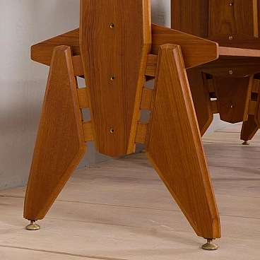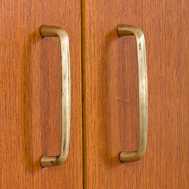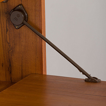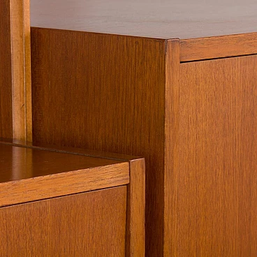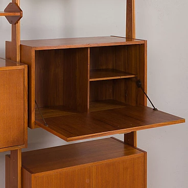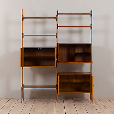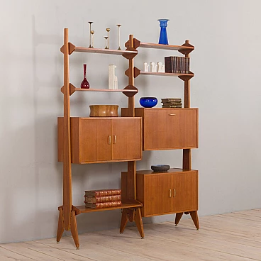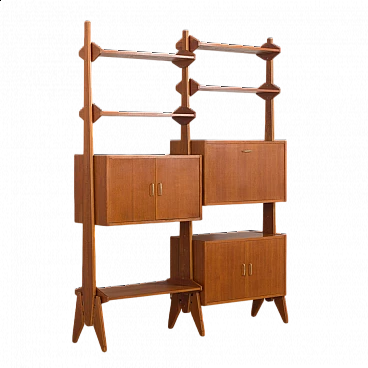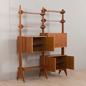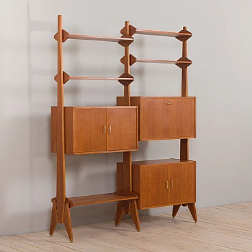 Libreria vintage italiana, mobile a parete indipendente che può essere anche un perfetto divisorio per ambienti. Risale agli anni '60 e riprende fedelmente il design di Vittorio Dassi dello stesso periodo. Questo pensile vintage è realizzato in impiallacciatura di teak. Presenta cinque mensole, due armadietti e un mobile bar. Questa straordinaria composizione di armadi e scaffali, così come il retro ben rifinito in impiallacciatura di teak, lo rende un perfetto divisorio per ambienti. Questo pensile italiano è un elemento di spicco per qualsiasi spazio moderno di metà secolo. Fornito di piedini regolabili in ottone, può stare saldamente in piedi su pavimenti irregolari.