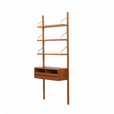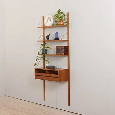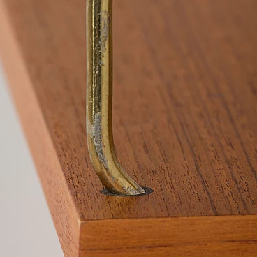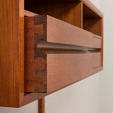 Pensile d'ingresso vintage di Poul Cadovius che proviene dalla Danimarca e risale agli anni '60. Semplice, ma elegante, arricchirà qualsiasi ingresso, camera da letto o soggiorno. Le parti possono essere scambiate e la console può essere appesa più in basso o al centro. È composta da: tre ripiani profondi 24 cm; una piccola consolle con due cassetti e due ripiani aperti H: 24/ L: 80 / P: 30 cm, altezza cassetti: 10 cm; due binari in legno massiccio lunghi 200 cm; ferramenta in ottone.