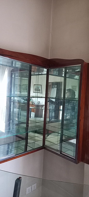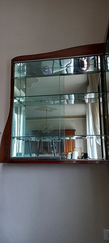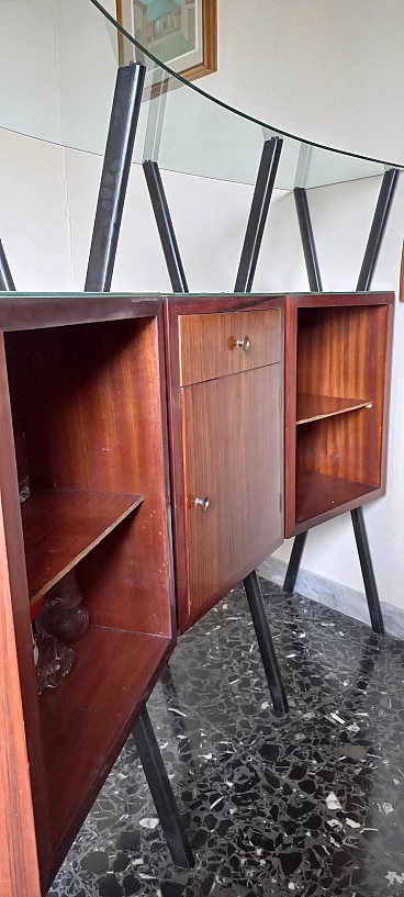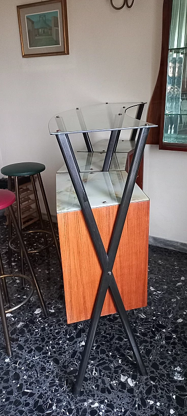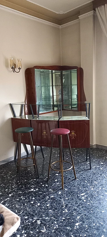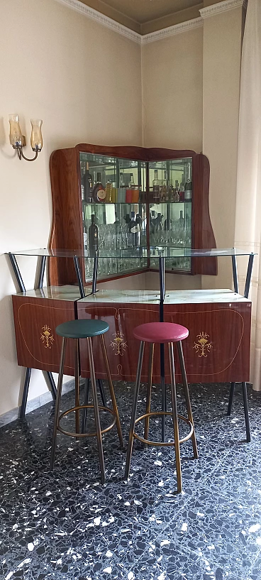 Mobile bar ad angolo in mogano con coppia di sgabelli, anni '60