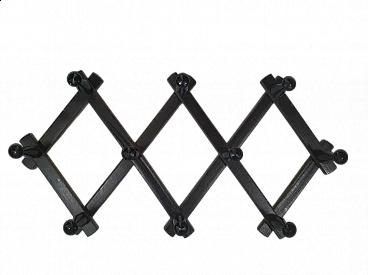 Appendiabiti da parete dei primi anni '80 di produzione italiana, interamente in legno con diversi ganci. Larghezza chiuso 10 cm, larghezza aperto max 84 cm, altezza 33 cm.