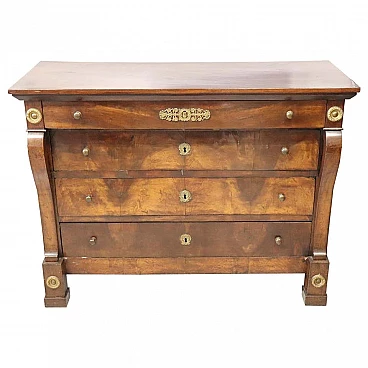 Bellissimo comò antico epoca impero detto a bretelle per la decorazione presente sul fronte ai lati. Realizzato in noce lastronato con piano e fianchi in massello. Ricche decorazioni in bronzo dorato finemente cesellato. Ottime condizioni articolo antico usato da segnalare alcun segni di usura sul piano e alcuni piccoli tasselli di lastronatura mancanti sul fronte. Prezzo trattabile inviate la vostra proposta di acquisto.