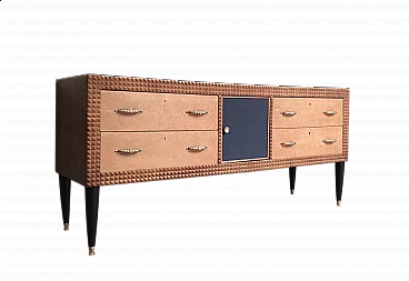 Comò di produzione Consorzio Esposizione Mobili Cantù anni '50. Realizzato in ciliegio, acero e palissandro con piedi in legno ebanizzato, top e vano bar in specchio, maniglie e puntali in ottone. L'anta centrale è in tessuto ottanio. Ottime condizioni, il marchio di fabbrica è presente sui cassetti superiori, come evidenziato in foto. Lunghezza 178 cm, altezza 80 cm, profondità 52 cm.