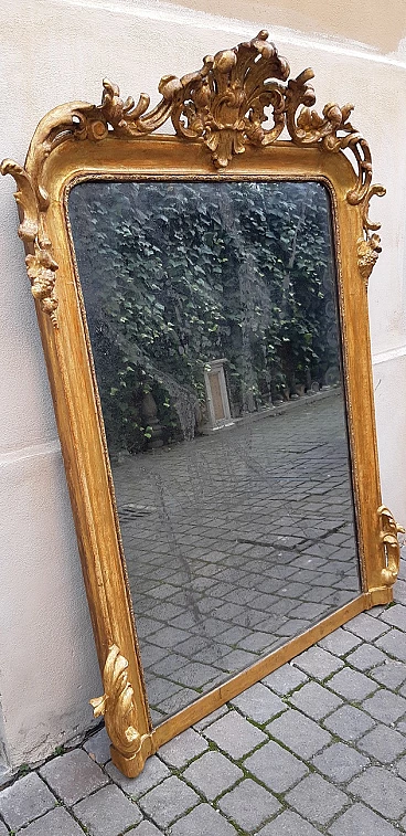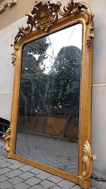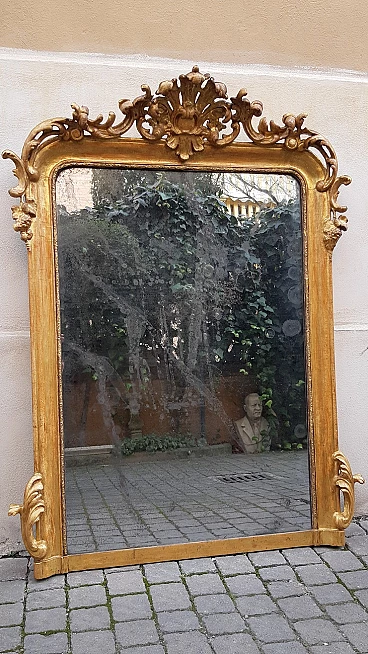 Importante specchiera in legno dorato di origine piemontese della prima metà dell’XIX secolo. Il ricco fastigio a motivi floreali gli dona eleganza, mentre i due motivi alla base della stessa ne richiamano le movenze. Uno splendido specchio al mercurio/argentato contribuisce nel distinguerla ed ulteriormente impreziosirla. Dimensioni (cm): H 153 cm, larghezza 115 cm.