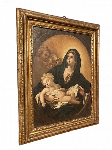 Dipinto a olio su tela del '700 di scuola italiana raffigurante la Madonna con il Bambino e angeli. Cornice antica in legno intagliato e dorato. Restaurato.