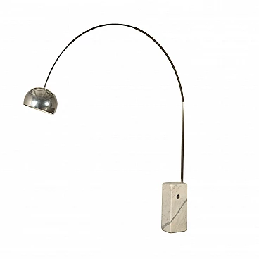 Lampada Arco, modello originale progettato nel 1962 dai fratelli Achille e Pier Giacomo Castiglioni e prodotto da Flos; struttura in acciaio e base in marmo. Prodotto in buone condizioni, presenta piccoli segni di usura. Dimensioni massime (cm): Diametro: 38