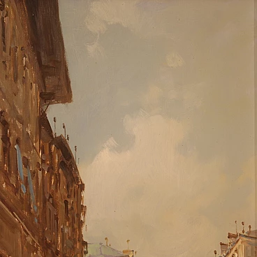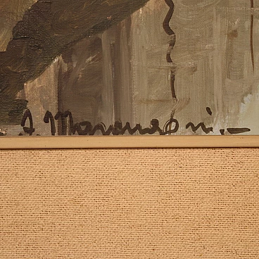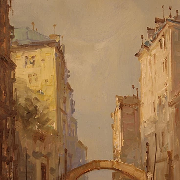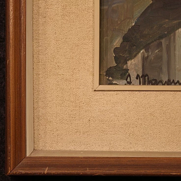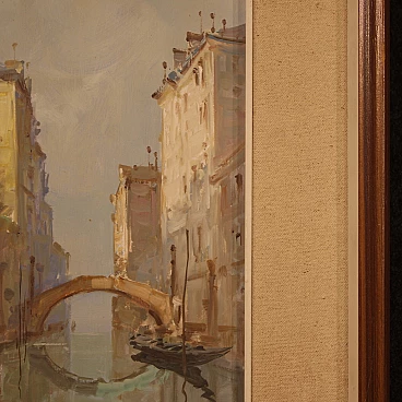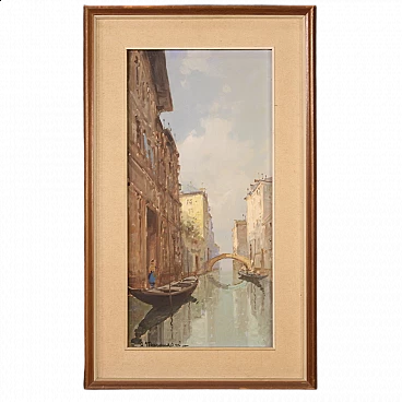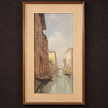 Dipinto italiano della seconda metà del XX secolo. Opera olio su tela raffigurante veduta di Venezia in stile impressionista di buona mano pittorica. Quadro che si sviluppa in verticale, di misura contenuta, con cornice lignea completa di passe-partout in tessuto (vedi foto). Dipinto firmato in basso a sinistra (vedi foto) A. Marangoni riferibile al pittore Aldo Marangoni (XX secolo) mancante di autentica. Quadro facente parte di un pendant (vedi foto e richiedi il prezzo in blocco, se disponibile). In buone condizioni con qualche piccolo segno del tempo. Luce dipinto H 58,5 x L 28,5 cm.