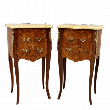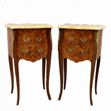 Coppia di comodini Napoleone III in legno intarsiato e marmo, primo '900