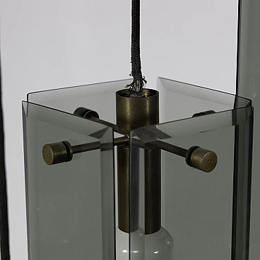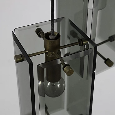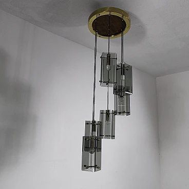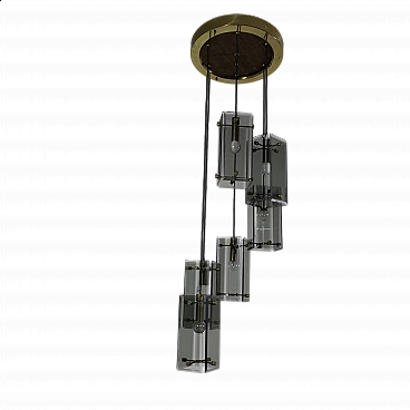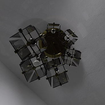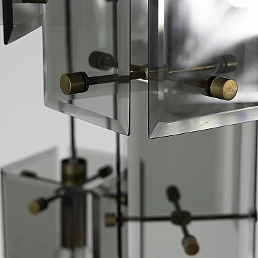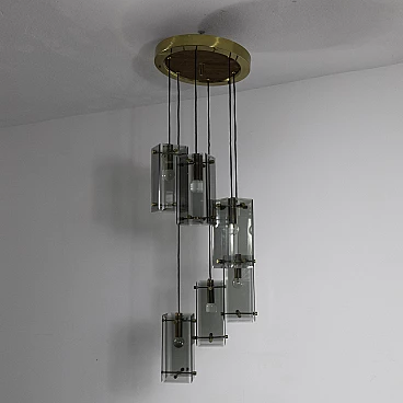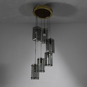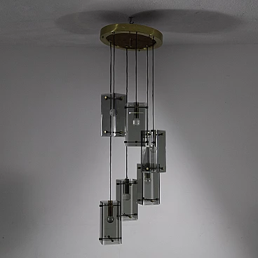 Lampadario a 6 luci in ottone e vetro molato, anni '70