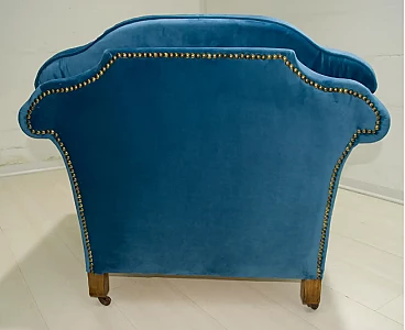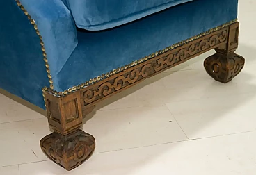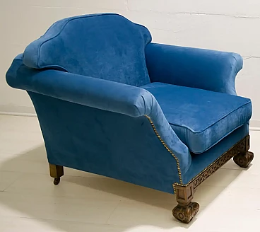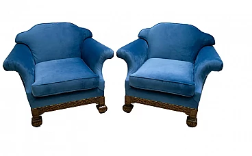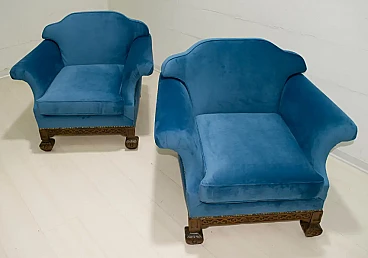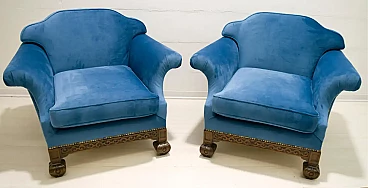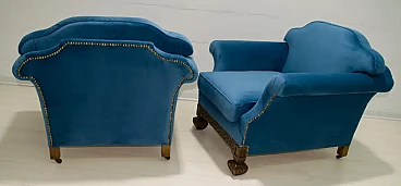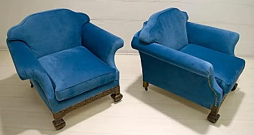 Coppia di poltrone in rovere e velluto blu, fine '800