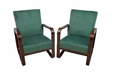 Coppia di poltrone Art Déco di Giuseppe Pagano e Gino Maggioni, anni '40. Struttura in legno curvato, seduta e schienale in velluto verde; il rivestimento è stato sostituito. Altezza della seduta: 43 cm. Queste poltrone sono state realizzate per l'Università Bocconi di Milano. Pagano (1896-1945) era un architetto, noto per il suo coinvolgimento nel movimento Razionalista in Italia fino alla fine della Seconda Guerra Mondiale; ha progettato mostre, mobili e interni ed è stato un fotografo amatoriale nonché redattore per lungo tempo della rivista "Casabella". Anche Gino Maggioni (1898-1955) era un architetto; dalla sua azienda "Brevetti Curvati Maggioni" sono usciti mobili importanti, che sono stati utilizzati per arredare, ad esempio, l'Università Bocconi di Milano.