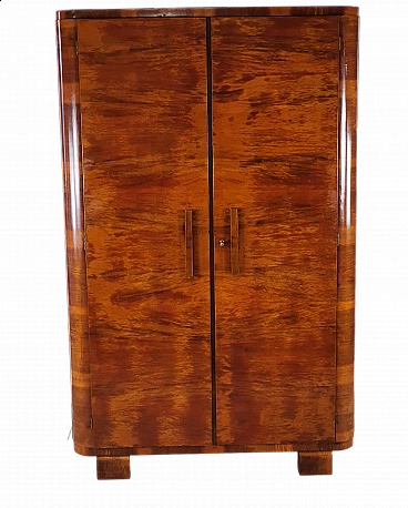 Fine ed elegante armadio a due ante in stile Decò interamente in legno di noce con ripiani interni in abete. Produzione italiana anni '40 circa. L'armadio si presta ad essere utilizzato in tutti i contesti, dal moderno all'antico, grazie alle linee compatte uniforme e lineari con delle leggere curvature ai due angoli. Molto particolari sono le maniglie in legno, inoltre l'armadio è dotato di serratura. Il mobile è stato lucidato ad olio e gommalacca. La serratura è funzionante, quando si gira la chiave bisogna fare 2-3 click. Disponibile l'armadio gemello con mensola e bastone.