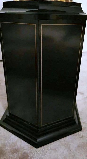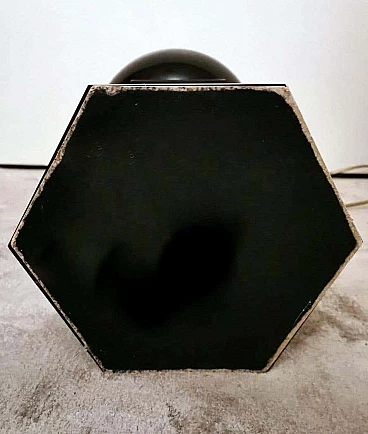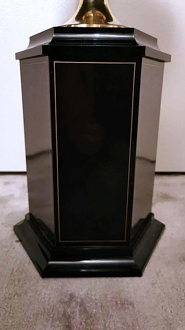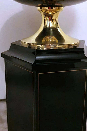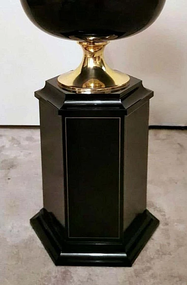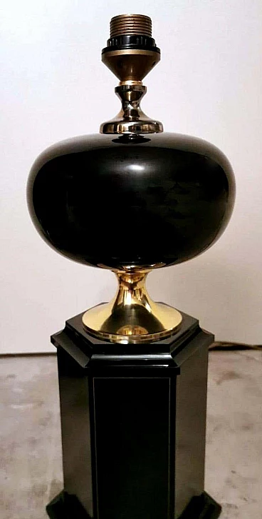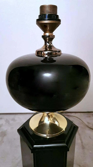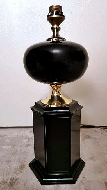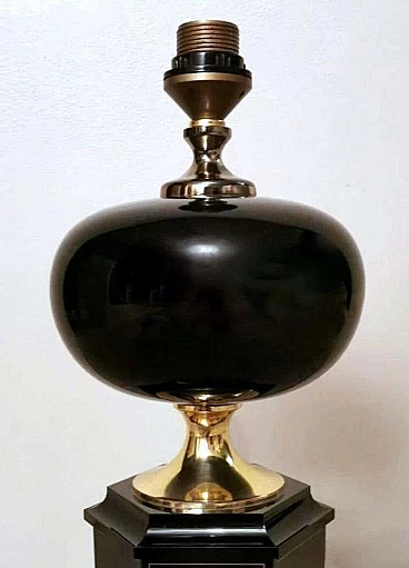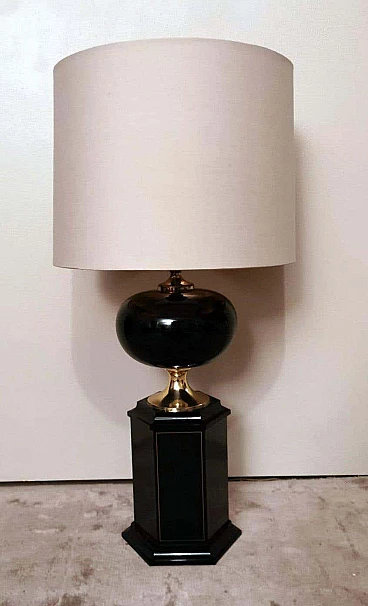 Iconica e raffinata lampada da tavolo francese. L'elegante base a sezione esagonale è in legno laccato nero e cresce in altezza, alla sua sommità si trova un supporto in ottone tornito su cui poggia una sfera appiattita ai poli in metallo smaltato, sopra la sfera si trova un altro supporto in ottone su cui è alloggiato il portalampada. Il design della lampada è sontuoso ma molto proporzionato, con un effetto decorativo appariscente ma elegante, proprio dello stile "Hollywood Regency". La lampada è stata creata a Parigi tra il 1970 e il 1975; dopo averne esaminato attentamente la manifattura e i materiali utilizzati, abbiamo svolto un'attenta e minuziosa ricerca e possiamo attribuirla con buona certezza alla Maison Jansen, azienda francese emblema internazionale dello stile lussuoso. Nel 1880, all'apice della Belle Époque, Jean-Henri Jansen emigrò dall'Olanda per aprire un negozio di mobili in Rue Royale a Parigi. La Maison Jansen fu un successo fin dall'inizio. Il negoziante rimase subito colpito dalle sue vetrine sontuose e dettagliate e dal suo approccio unico alla vendita dei mobili. Nel giro di dieci anni, Maison Jansen non era più un negozio, ma un'azienda di design in rapida espansione con una clientela ricca e fedele, che avrebbe mantenuto per quasi un secolo. Era una delle case di arredamento più famose e influenti del XX secolo, frequentata da famiglie reali, personaggi dell'alta società, leader nazionali e altri luminari della società d'élite. È stata una delle prime aziende di design propriamente globali, una delle voci più influenti del XX secolo, un'eccellenza che ha contribuito ad affermare lo stile Jansen come protagonista indiscusso della storia del design. La genialità dell'azienda risiedeva nella straordinaria capacità di recuperare forme, colori e materiali suggestivi del passato. I pezzi più ricercati riflettevano l'influenza del design del passato, dallo stile Luigi XIV allo stile Luigi XVI, dall'epoca del Direttorio alle suggestioni imperiali. Nel 1929, alla morte di Jansen, l'azienda continuò ad espandere la sua presenza nel mondo sotto la guida di Stèfan Boudin, fedele collaboratore di Jansen; a Stéphane Boudin successe, dopo la sua morte nel 1967, il collaboratore e collega di lunga data Pierre Delbée, la cui residenza a Parigi era famosa in tutto il mondo come apice dell'estetica lussureggiante di Jansen, continuando a rappresentare l'azienda nei suoi migliori progetti fino al 1979, quando l'azienda passò di mano. L'attività non durò a lungo dopo la sua partenza e la Maison Jansen chiuse i battenti nel 1989, più di un secolo dopo la sua fondazione. Durante la sua attività, la Maison Jansen ebbe clienti e commissioni molto prestigiosi: Guglielmo III d'Olanda, Alfonso XII di Spagna, il Duca e la Duchessa di Windsor, i Rockefeller, Elsie de Wolfe, la nipote di Nancy Astor, Nancy Lancaster, il milionario americano Henry Channon, i Kennedy e Coco Chanel, il restauro della Casa Bianca, compresa la famosa Red Room, durante l'amministrazione di John Kennedy, l'arredamento del Castello di Leeds di Lady Olive Baillie nel Kent, in Inghilterra, l'interior design del motor yacht Chambel IV, ora ribattezzato Northwind II. La lampada viene fornita senza paralume, in modo che ognuno possa scegliere il colore in modo personale per adattarlo al proprio arredamento. La foto con il paralume è solo un esempio. La lampada è in ottime condizioni. L'impianto elettrico è funzionante ma il cablaggio è europeo, la compatibilità di tensione in altri stati deve essere sempre verificata da un elettricista prima dell'uso. Misure diametro 22 cm, altezza 36 cm. Per tutte le nostre spedizioni utilizziamo materiali di imballaggio speciali (casse di legno, polistirolo, ecc.) per la massima protezione e sicurezza degli articoli.
