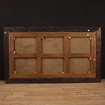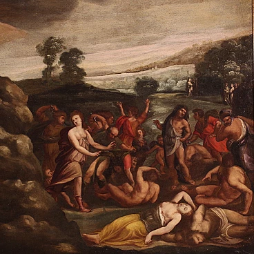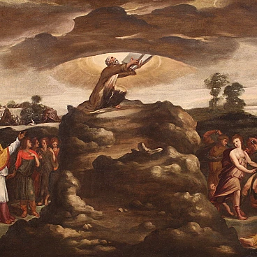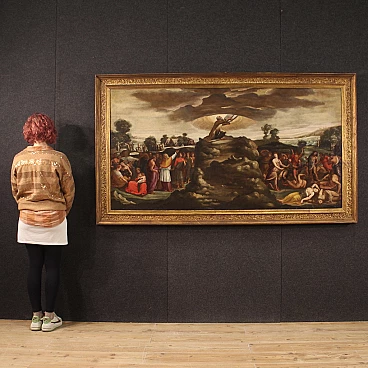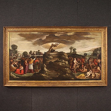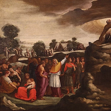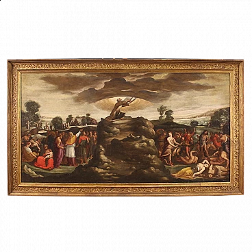 Antico dipinto italiano del XVII secolo. Opera ad olio su tela che si sviluppa in orizzontale raffigurante diversi eventi Biblici della storia di Mosè, di buona mano pittorica. A sinistra troviamo il popolo ebraico in fuga dall'Egitto. A destra invece abbiamo una delle tante battaglie che il popolo di Israele dovette affrontare nei quarant'anni nel deserto. Al centro la consegna delle tavole della legge. Una volta giunti ai piedi del monte Sinai gli israeliti videro tuoni e lampi e solo Mosè non ebbe timore e salì per ricevere i dieci comandamenti. Quadro di grande misura e impatto, ricco di personaggi e di piacevole dinamismo. Cornice del XX secolo in legno e gesso finemente cesellata e dorata, di bella decorazione. Opera che ha subito un intervento di restauro conservativo, rintelo, sostituzione del telaio e ripresa del colore in diversi punti. In buone condizioni. Luce dipinto H 95 x L 182 cm.