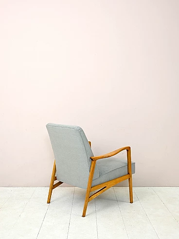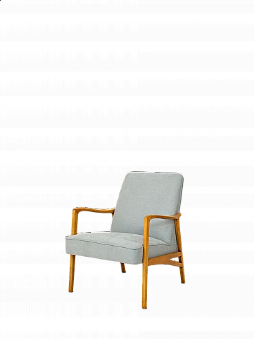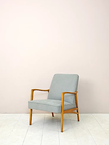 Poltrona scandinava con struttura in legno e rivestimento in tessuto azzurro, anni '60