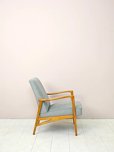 Poltrona anni ‘60 di modernariato svedese. Un pezzo d’arredo moderno e dalle linee di metà secolo. La struttura in legno presenta delle linee originali ed eleganti. La seduta e lo schienale sono imbottiti e sono stati rifoderati con del tessuto azzurro chiaro effetto velluto. Comoda e dal gusto retrò saprà arredare la stanza in perfetto stile scandinavo. Buone condizioni. È stato fatto un restauro conservativo con prodotti di origine naturale. E’ stata rifoderata. Potrebbe presentare dei segni del tempo. Per piacere presta attenzione alle fotografie.