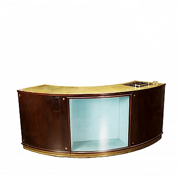 Bancone da bar con vani bottiglie nella parte interna e sul piano con teca espositiva sul fronte con plexiglas. Realizzato in legno compensato curvato tinto ebano con piano ed intarsi decorativi in ottone.